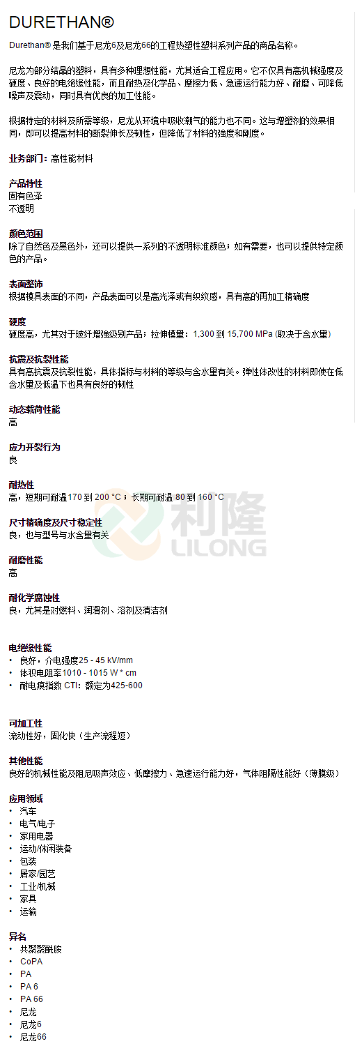 >> 德國朗盛DURETHAN品牌系列尼龍PA6塑膠原料
