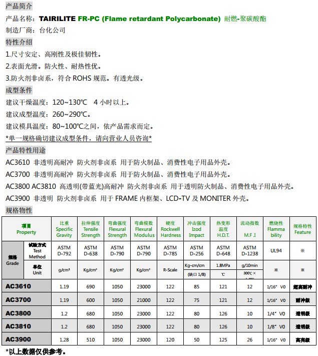 1.非透明性 2.高耐衝擊強(qiáng)度 3.射出用途 4.非鹵系、符合RoHS規(guī)範(fàn) 5.符合UL 0.8mm V-0 | |||